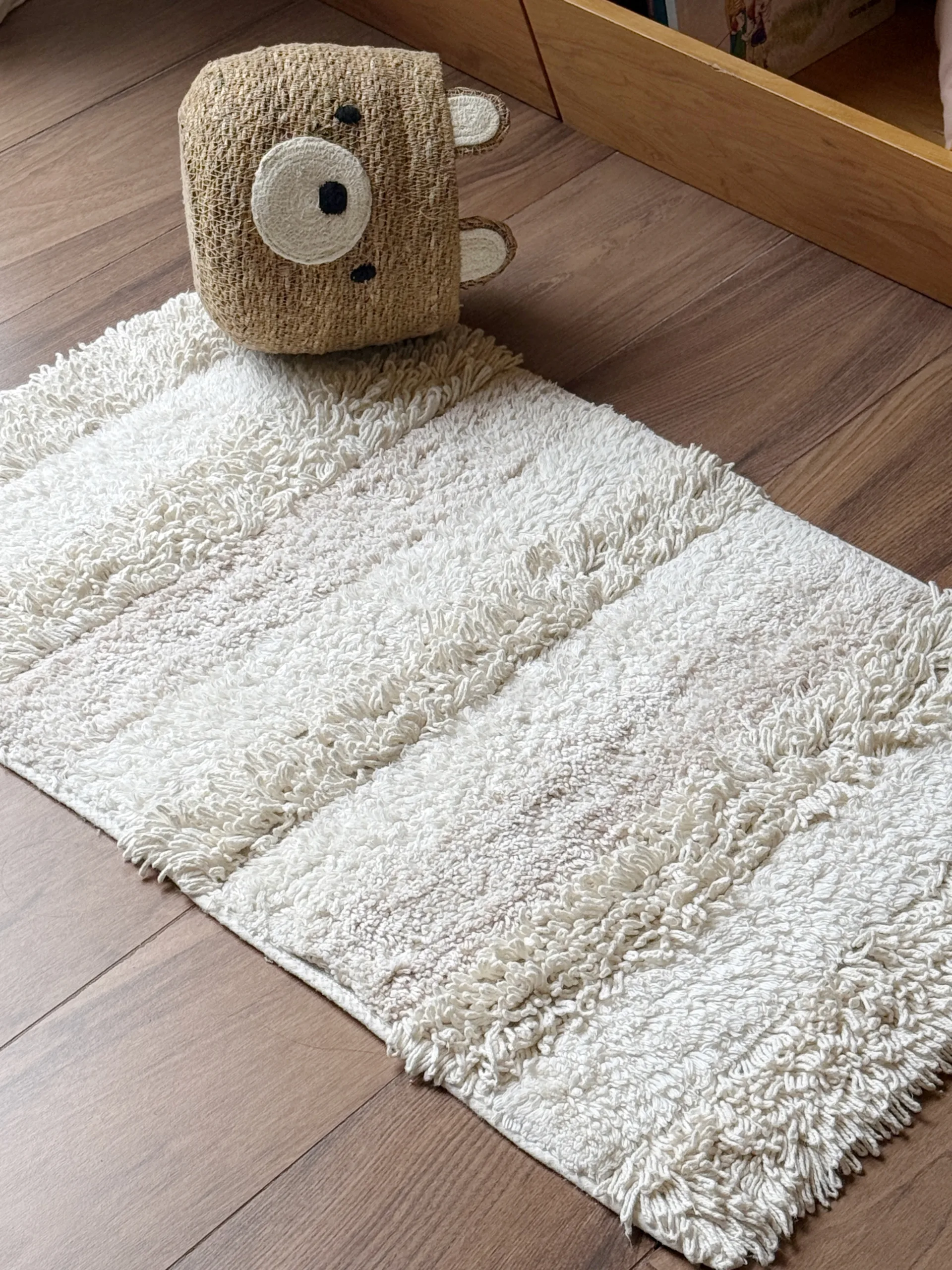 Alfombra rectangular de algodón color crudo con diseño de rayas texturadas en relieve.