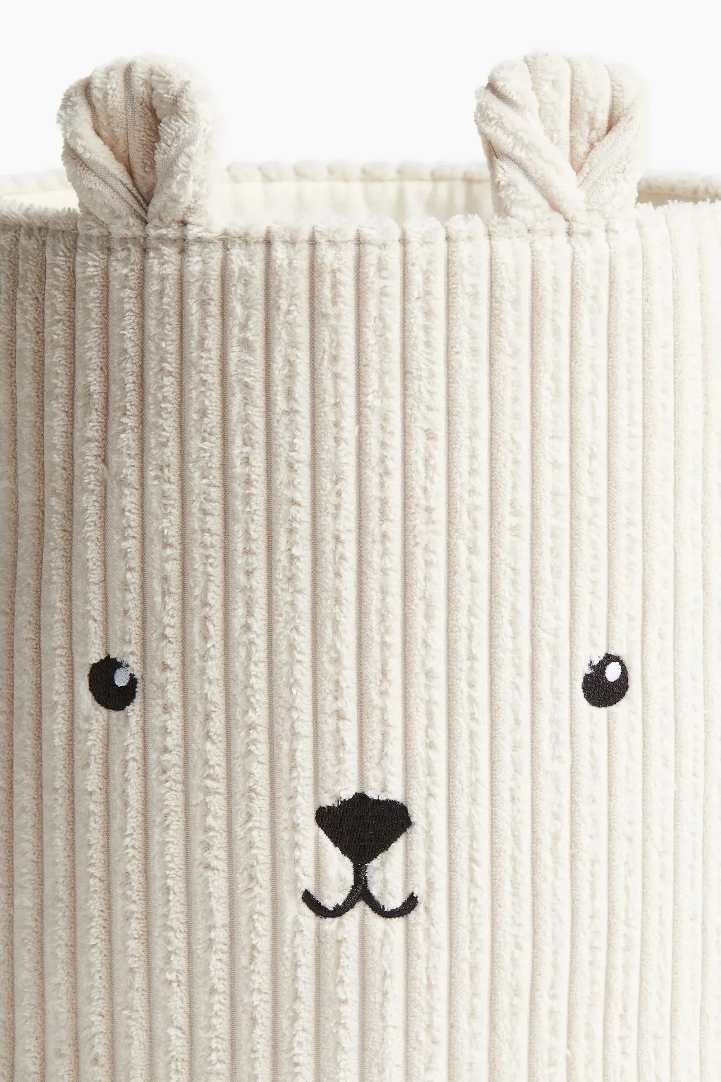 Modelo con rasgos faciales bordados, apliques en forma de oreja y asas laterales para llevarla fácilmente.